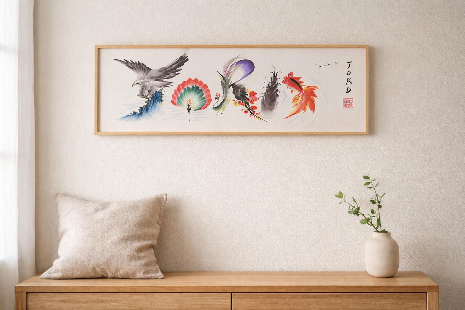 This panoramic format is ideal for living rooms, dining rooms, above consoles, in hallways, or office spaces where its expansive composition can be fully appreciated. The piece complements Japandi, wabi-sabi, modern chinoiserie, and Asian-inspired interiors, bringing auspicious symbolism and natural harmony to your space.