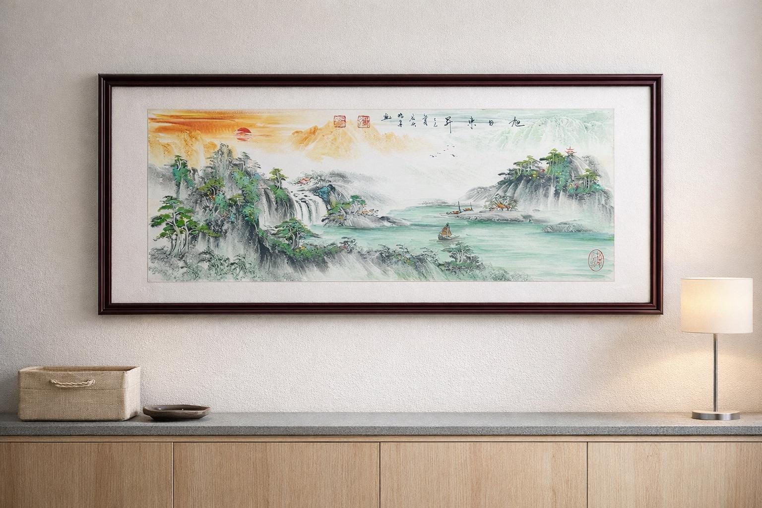 Rising Sun Panorama Painting, Original Chinese Ink Wash Landscape, 50x130cm Horizontal Wall Art, Made to Order